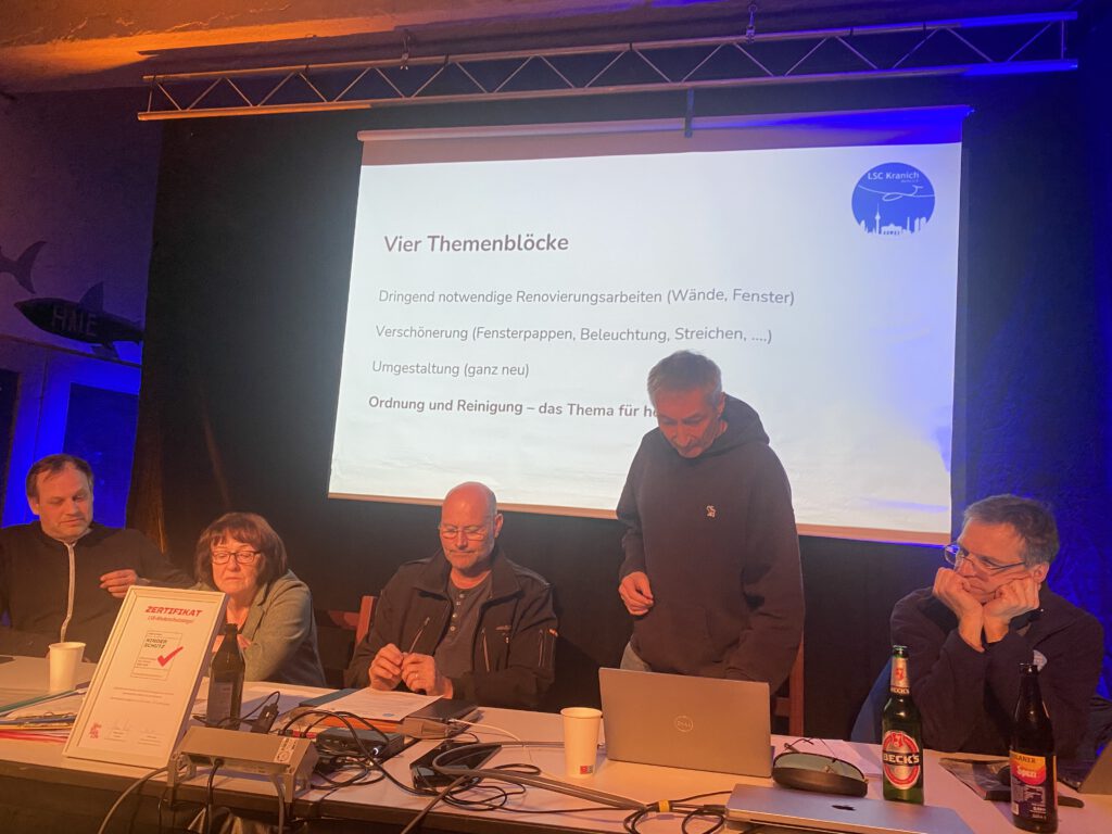 Danach wurde ein noch nie da gewesen professionell ausformuliertes Zukunftspapier dem aufmerksamen Publikum dargebracht. Obwohl Internes auch intern bleiben muss, sei hier gesagt: Dem Verein geht es gut! Die Mitgliederentwicklung ist sehr gut, leider hält die perspektivische Ausstattung mit Fluglehrern dem nicht ganz stand, wenngleich nicht unlösbar. Die Kraniche sind in der komfortablen Lage Mitgliedsanträge auszusieben. Das Ziel ist kein kurzatmiger Lifestyle-SchülerIn für den reinen Lizenzerwerb, sondern langfristig Engagierte zu gewinnen, sicher kein ganz leichtes Unterfangen, welches Fingerspitzengefühl verlangt.